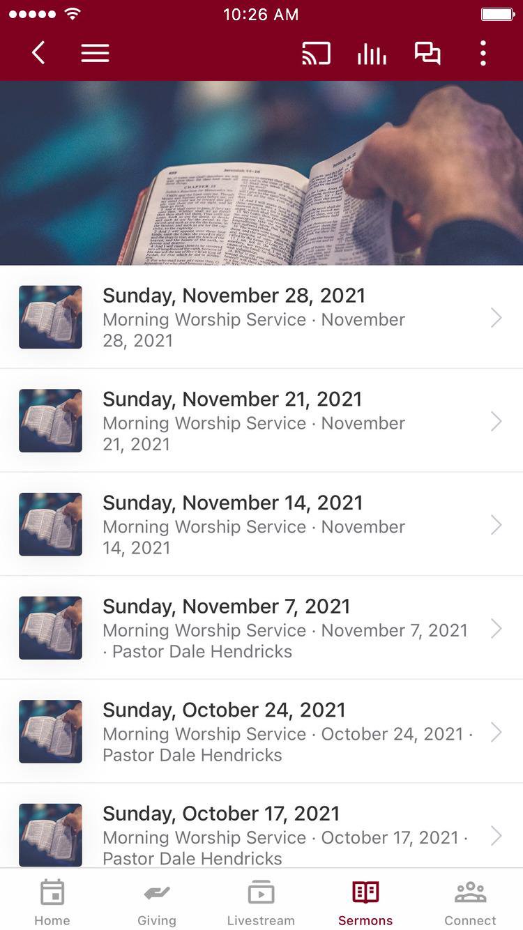 This app will help you stay connected with the day-to-day life of our church. With this app you can: watch or listen to past messages; stay up to date with push notifications; share your favorite messages via, Facebook, or email; and download messages for offline listening.