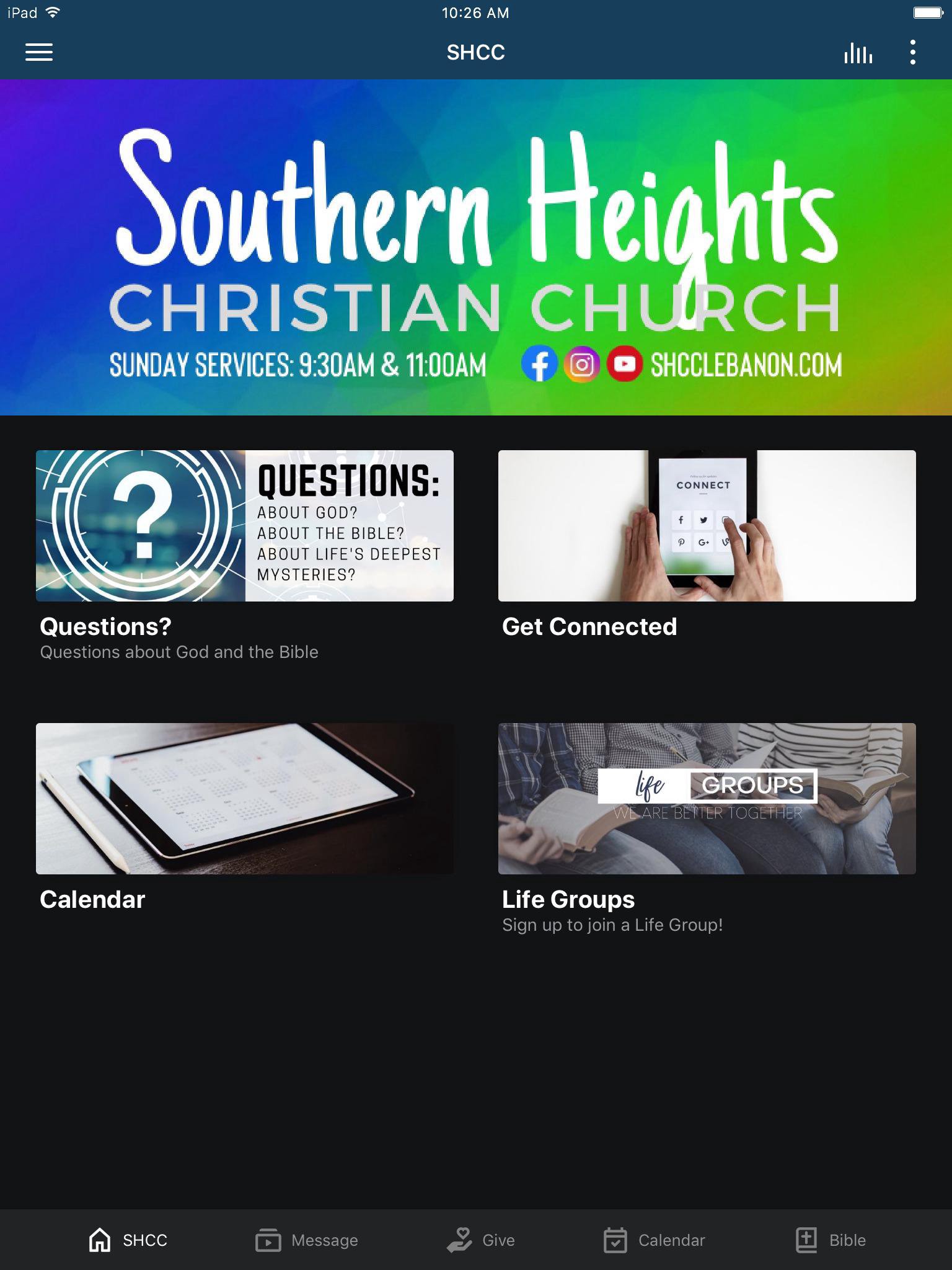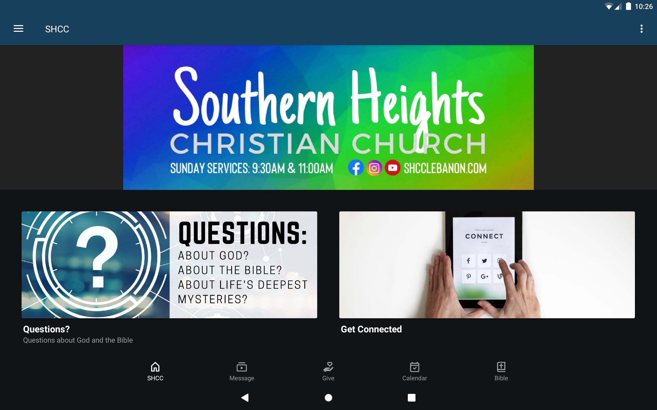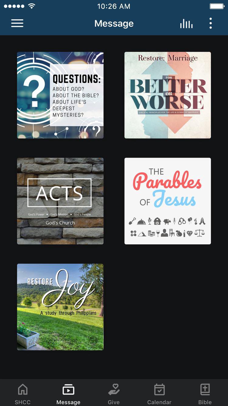 This app will help you stay connected with the day-to-day life of SHCC. With this app you can: - Watch or listen to past Messages - See upcoming Events/sign up for Events - Stay up-to-date with push notifications - Share your favorite messages via Twitter, Facebook, or email - Download messages for offline listening