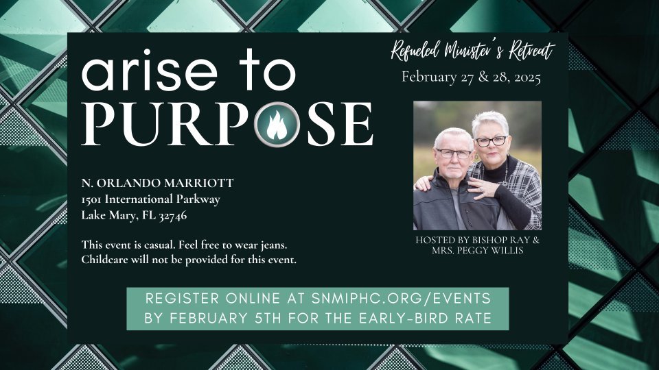 All SNM Pastors and Ministers are invited to join us for Refueled 2025 as we Arise to Purpose! Don't worry about contacting the hotel. We'll make your reservation for you. Just click "Register Now" to get registered today! The deadline to register at the price of $285 per room is February 5th! Don't wait! Register today!
