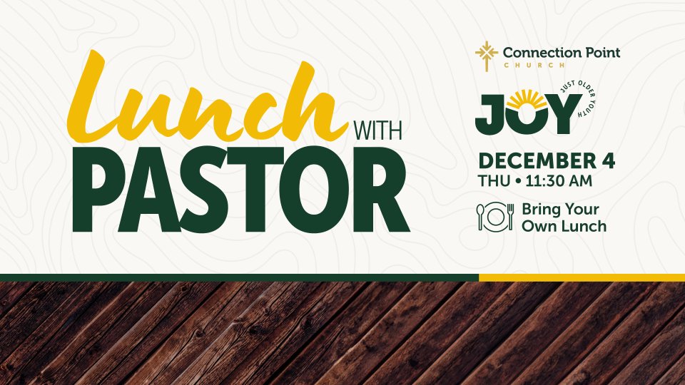 Come spend a lunchtime with Pastor! Enjoy community with fellow Seniors, discussing Scripture, a time of Prayer, and help plan future Senior outings.