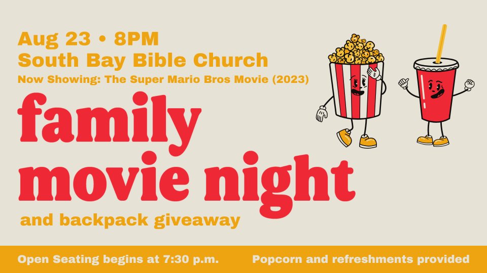 Join us for a very special movie night on Friday, August 23rd. In addition to screening The Super Mario Bros. Movie (2023) on the front lawn of South Bay Bible Church, and in addition to the free popcorn, free ice cream, and free snow cones, we will also be giving away free backpacks filled with school supplies!