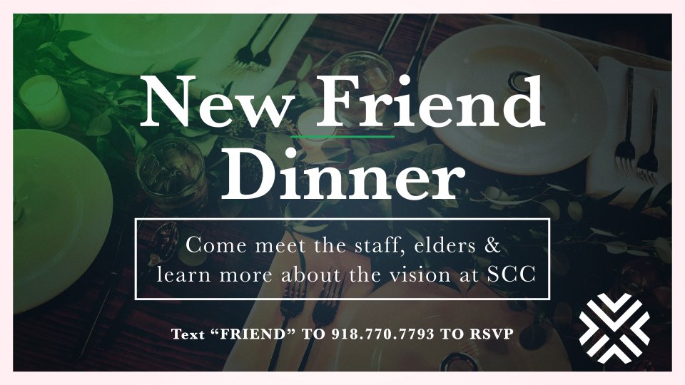 Come meet the staff & elders while enjoying a delicious dinner in the Community Life Center. We hope you can join us to learn more about SCC past, present, and future. Free childcare will be provided, so bring the family! Text "FRIEND" to 918-770-7793 to RSVP.