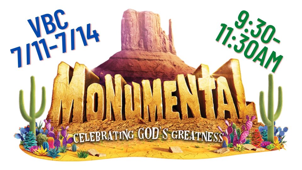 Go off-road for a Monumental adventure through the colorful canyons and sunbaked trails of the southwest. By exploring God’s awesomeness, kids form a rock-solid faith for the road ahead. Monday July 11 - Thursday July 14 9:30 - 11:30 am For kids, fall of 2022, in K - 6th grade. In Person Registrations Only Now - Thanks! Preschool spots are FULL (3's & 4's must be potty trained) contact church for more info. Crew Leaders (7th grade and up, fall 2022) are full.