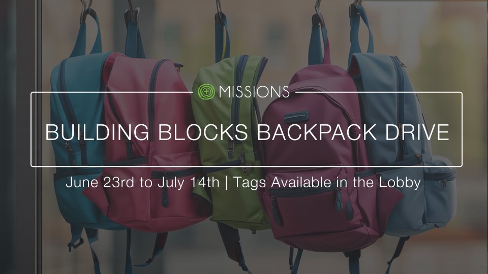 Join us as we partner with Building Blocks Preschool in their annual Backpack Round Up. We will be collecting backpacks with supplies to support our local community to ensure students start their school year off with all the supplies that they need. Building Blocks will be at The Chapel on Sunday, June 23rd to pass out backpack tags. We ask that all backpacks be filled and turned into The Chapel by Sunday, July 14, 2024.