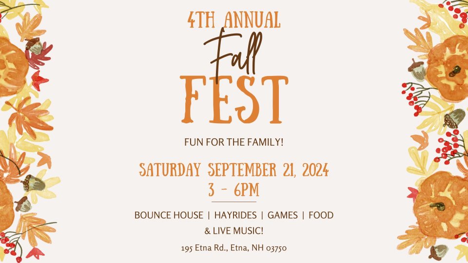 Mark your calendar for an unforgettable autumn celebration! On Saturday, September 21st, the charming town of Etna, New Hampshire, is set to host the much-anticipated Fall Fest. This family-friendly event promises an afternoon full of fun, games, live music, and great food. Prepare to be swept away by the festive atmosphere and the warm, welcoming spirit of the community. The Fall Fest will be held at the First Baptist Church Etna, located at 195 Etna Road. This historic location offers an ideal setting for community gatherings and celebrations. The Fall Fest is designed to bring together people of all ages. Whether you're a local resident or a visitor looking for an authentic New Hampshire experience, the Fall Fest is the perfect occasion to mingle, enjoy good music, and eat some good food fresh off the grill. The festivities kick off at 3:00 PM. From the moment you step onto the grounds, you'll be greeted by the sound of live music filling the air. Local bands and talented musicians will take the stage, providing the perfect soundtrack to your Fall Fest experience. While the music plays, you can also participate in a variety of games designed for attendees of all ages. Whether you're competitive or just looking to have a casual, fun time, you're sure to find a game that you'll love. Of course, no festival would be complete without food and drinks!