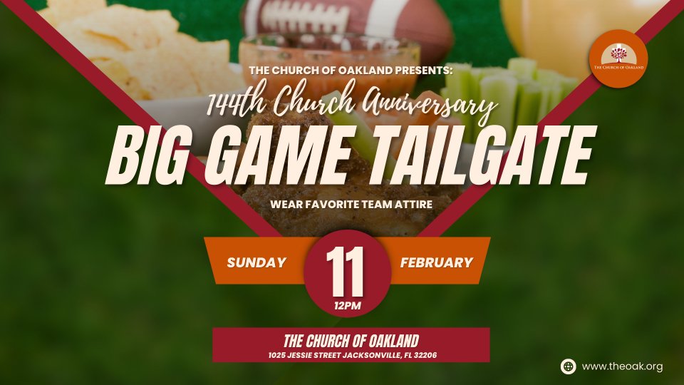 Big Game Tailgate ๐ February 11, 2024 โฐ Immediately following worship ๐The Church of Oakland | 1025 Jessie St. Jacksonville, FL 32206