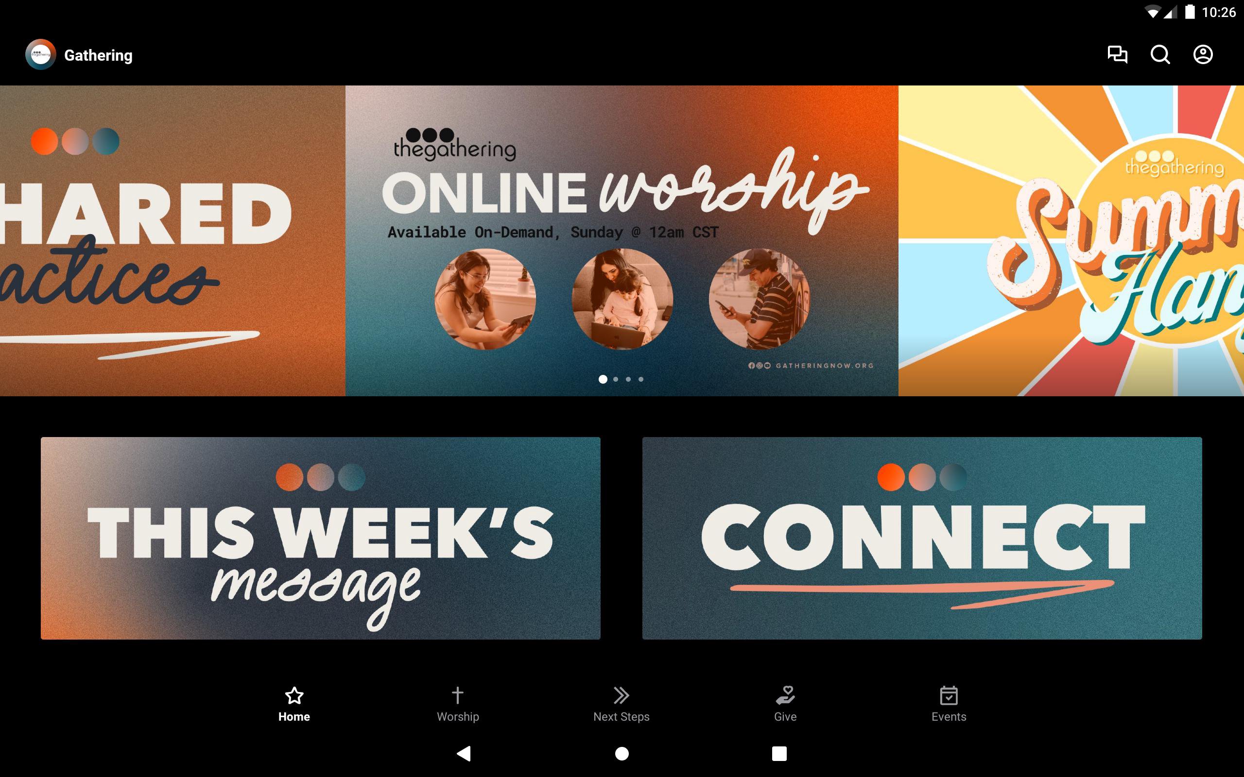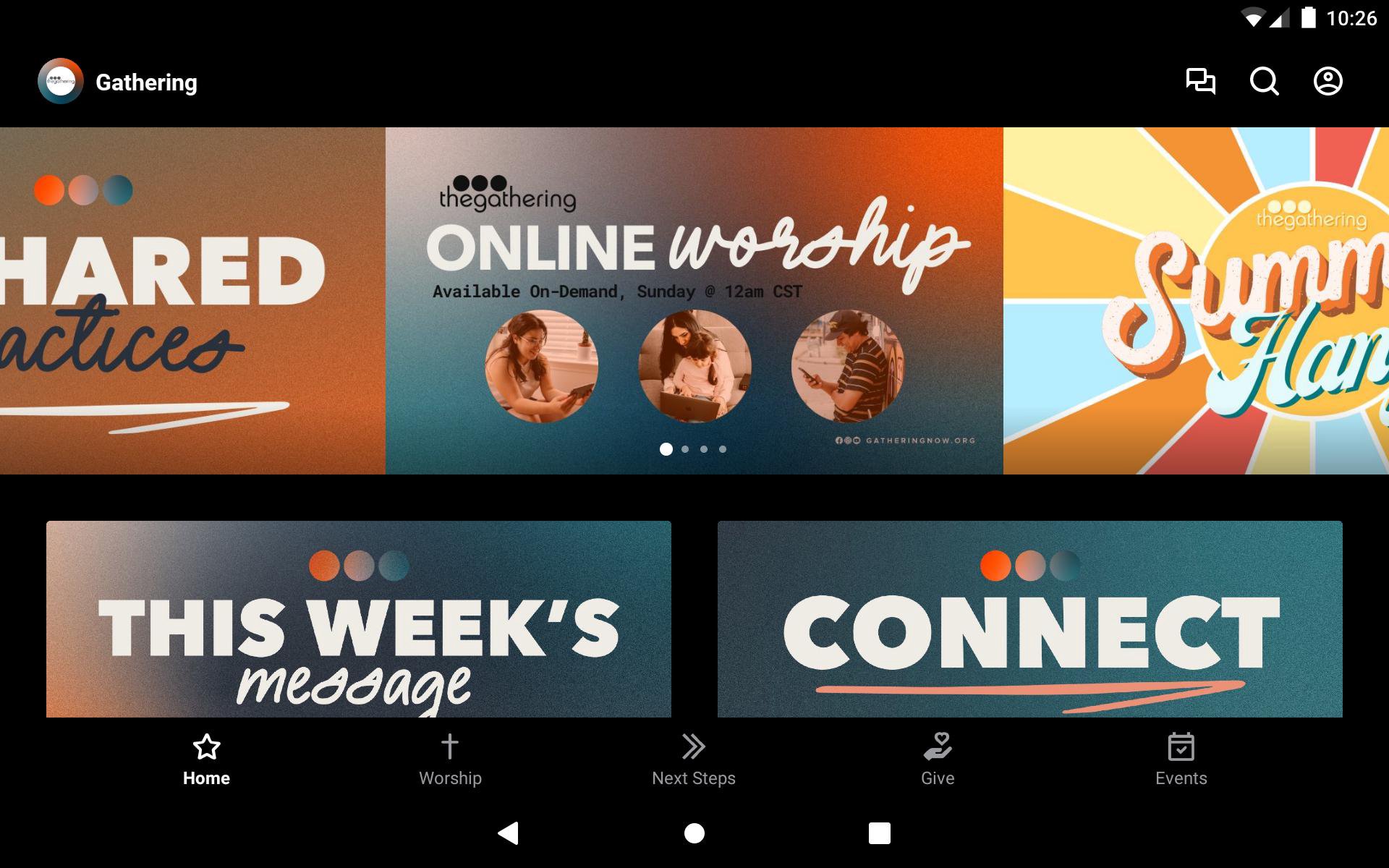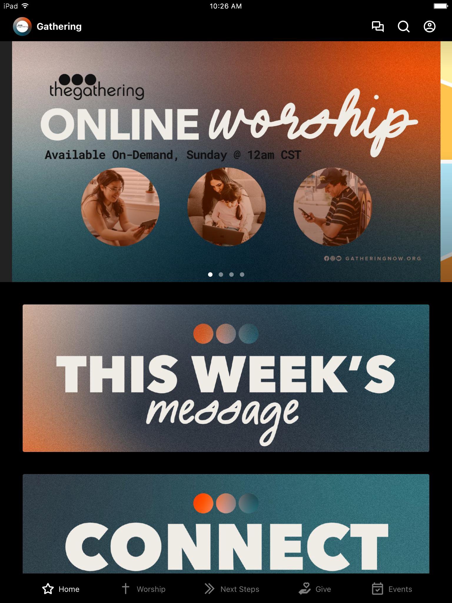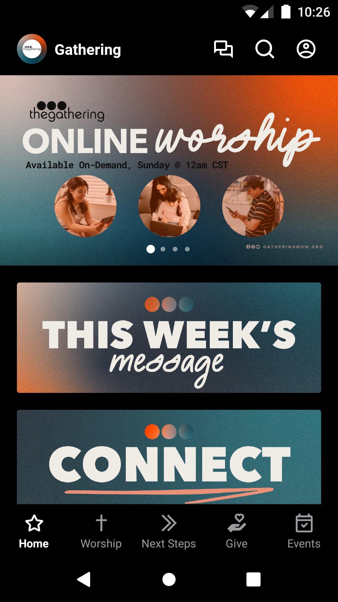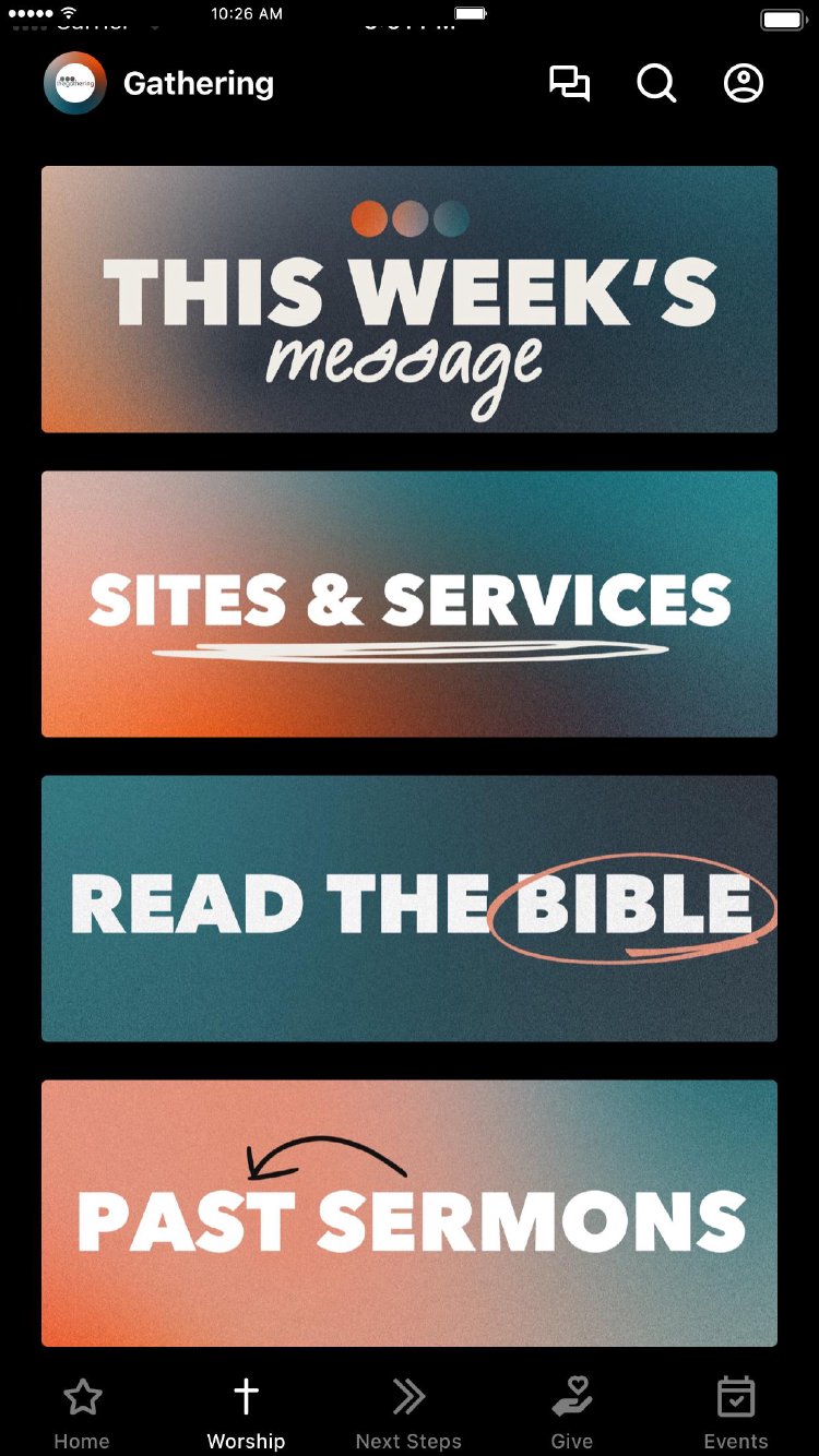 The Gathering exists to create a Christian community that is compelling for new generations of people. It is our mission to invite people to become deeply committed followers of Christ. Through the Gathering app, you will be able to engage in the mission, vision and shared practices of the Gathering wherever you find yourself. The app allows you to: - View, listen to and interact with the SERMONS - Listen to the latest MUSIC being created and sung - Discover or Host a COREGROUP that fits your needs and schedule. - Integrate PRAYER into your daily routine - Practice GENEROSITY through online giving - Find ways to SERVE in our church - Commit yourself to reading the BIBLE consistently - STAY UPDATED on the latest happenings within the Gathering Becoming a follower of Jesus is directly related to our commitment to do the things Jesus did. The Gathering app is designed to provide RESOURCES, COACHING and ENCOURAGEMENT surrounding our shared practices of Worship, Groups, Prayer, Giving and Serving so that being led by Christ is more accessible in your daily life.