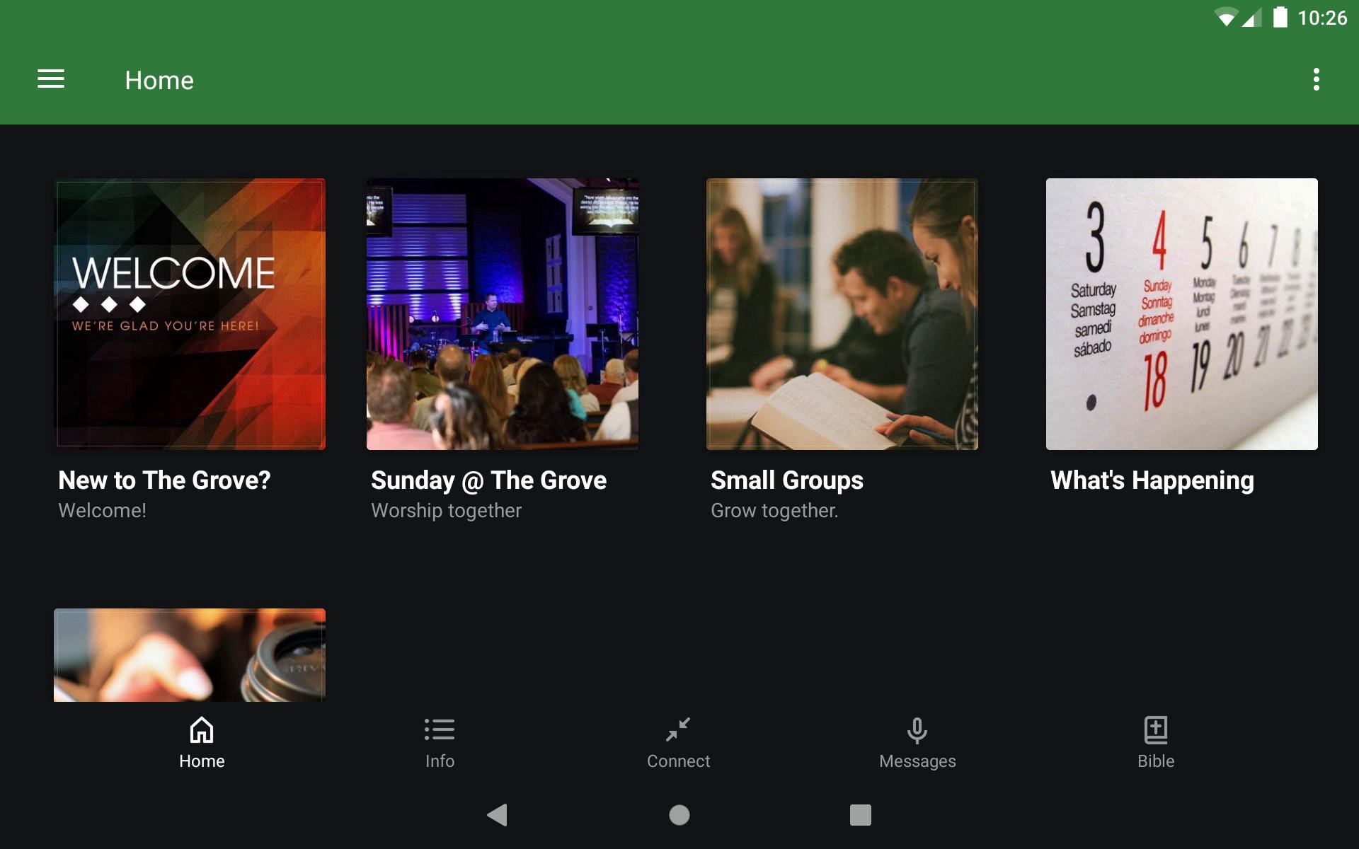 Welcome to the official mobile app of The Grove! With this app, you'll be able to stay up to date with events, listen to sermons, start a Bible reading plan, and share content with family and friends through social media. The Grove app was proudly developed with the Subsplash App Platform.
