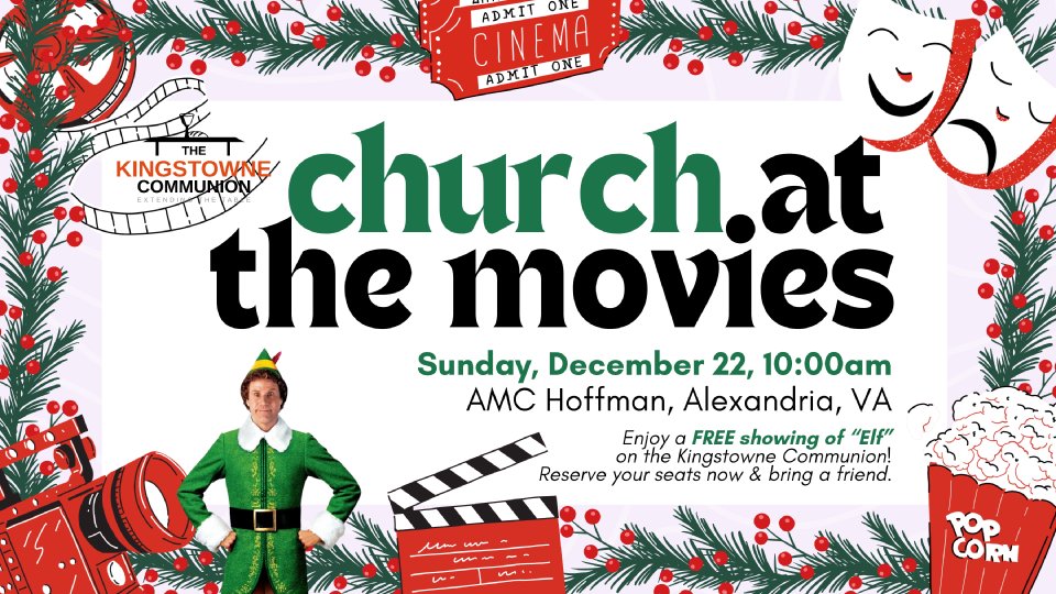 Wear your most Christmas-y clothing and join the Kingstowne Communion for a FREE showing of the favorite Christmas movie "Elf" in our own private theater on Sunday, December 22. Arrive at 9:45am if you want any concessions. Then meet in our TBA theater by 10am for one song, a prayer, communion, and a brief orientation to a guide we will provide to connect the movie to the Christmas story.
