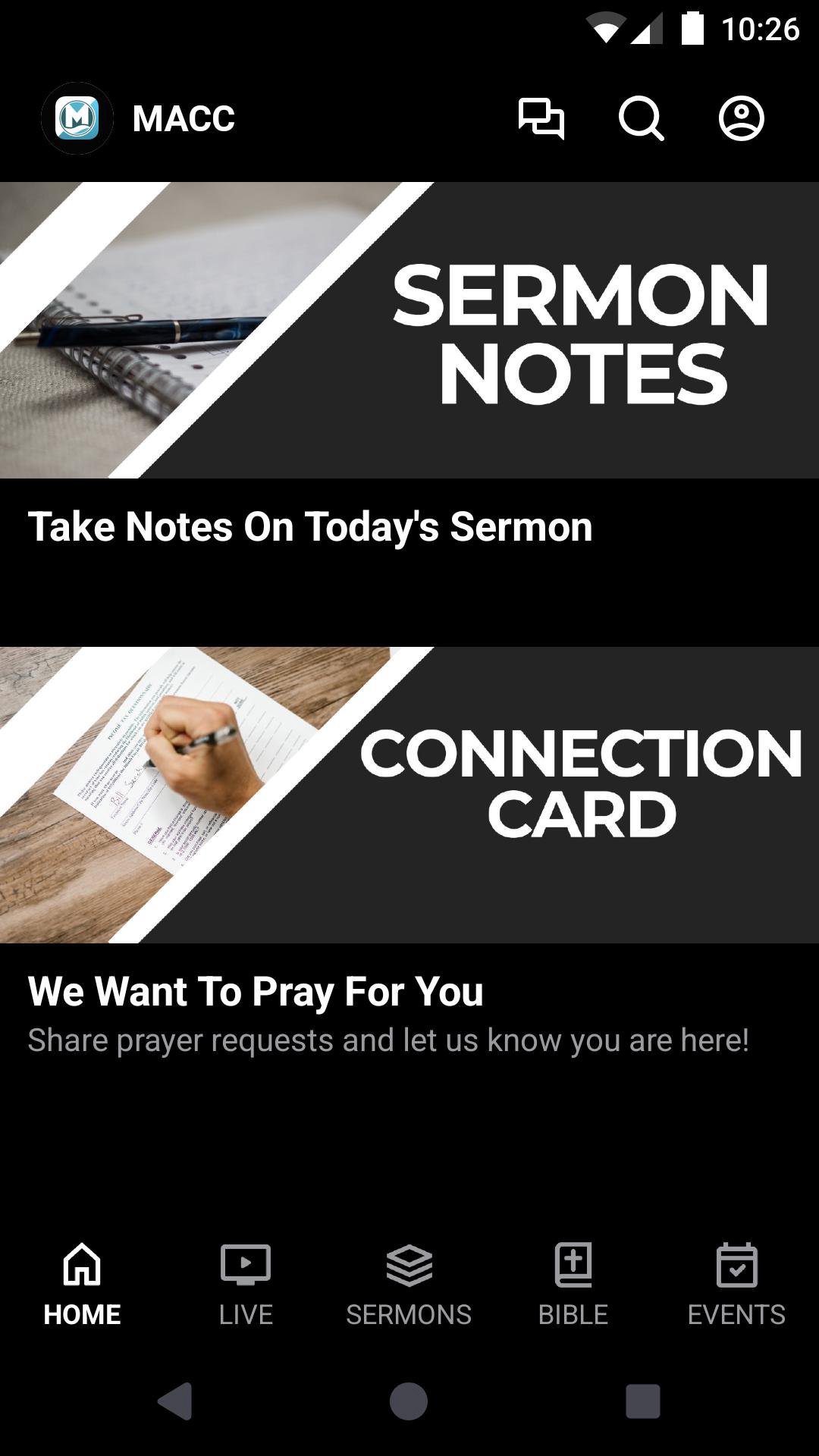 Welcome to the official Mid Atlantic Community Church app! Stay connected with everything that is going on at MACC. Watch live and archived sermons, read blogs, listen to podcasts, and stay up to date with the life and happenings going on here at MACC. For more information about Mid Atlantic Community Church please visit themacc.org.