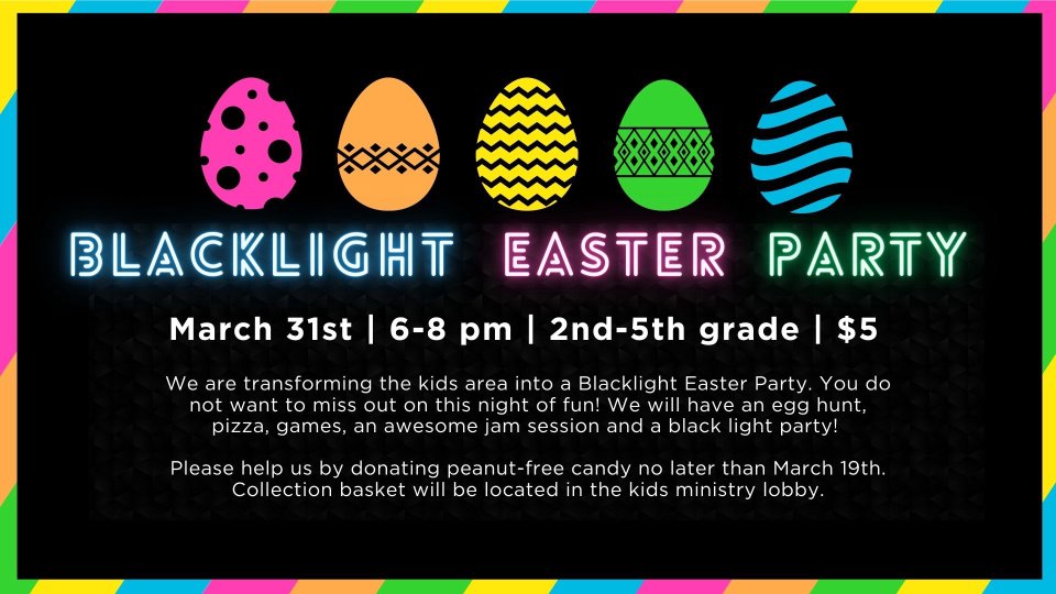 Join us for a night of fun! We will have an egg hunt, pizza, snacks, an awesome jam session, and a blacklight party!