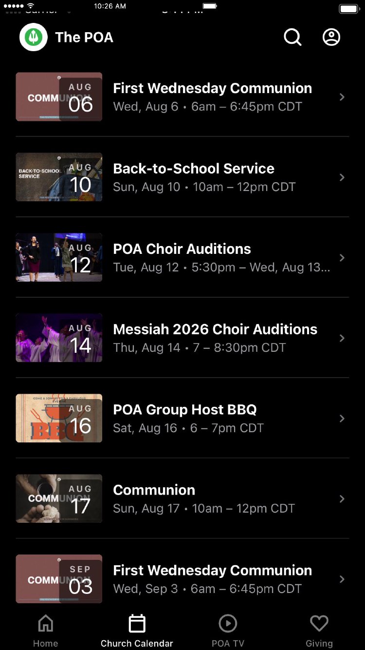 This app will help you stay connected to The POA. With this app you can: - Watch or listen to past messages - Stay up to date with push notifications - View live services - Download messages for offline listening - Stay in the know about upcoming events