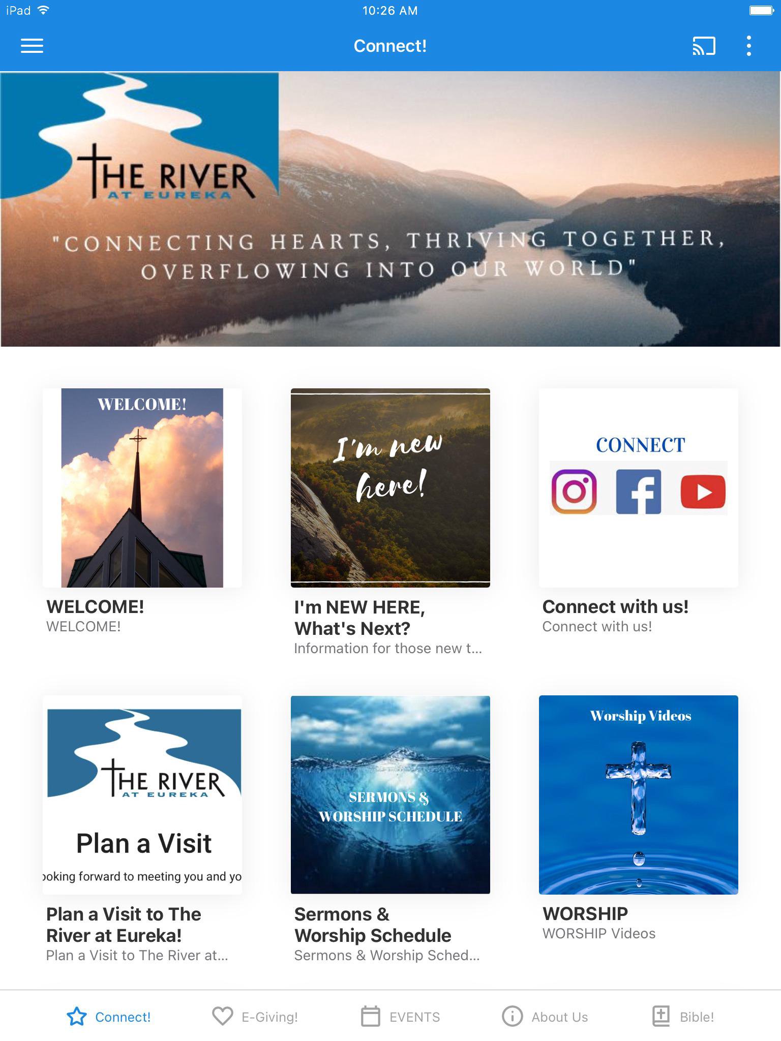 Welcome to the official app for The River at Eureka in Eureka, Missouri! The River At Eureka: ‘Connecting Hearts, Thriving Together, Overflowing Into Our World’. Sunday morning worship service times are 8:30am (traditional service) and 10am (contemporary service & online FB Live). Extreme Kids Children’s ministry is available during the 10am service. Childcare is offered during both worship services. You will find the following features available on this app: • Receive push notifications from the church. • Give On-line from inside the app. • Stay up-to-date with Events, Outreach and what is happening in the life of the church. • Digital Newsletters to read the latest news from within the app. • Read the bible with the built-in bible reader, as well as daily bible reading plan. For more information about The River at Eureka, please visit our website or follow our social media at the following: Website: http://the-river.church Facebook: https://www.facebook.com/TheRiveratEureka/ Instagram: https://instagram.com/TheRiverMO The River at Eureka app was created with the Subsplash App Platform.