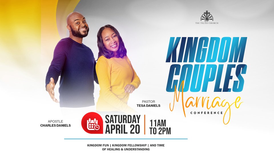 Welcome to the Kingdom Couples Marriage Conference! Join us for a day filled with insightful sessions, interactive workshops, and fun activities to strengthen your relationship. Whether you're newlyweds or have been married for years, this event is perfect for all couples looking to grow together. Come to The Truth Church and connect with other couples in a supportive and uplifting environment. You will receive a revolutionary perspective on marriage. Tired of hearing the same old 'marriage is hard' mantra? Are you having challenges in communication, intimacy, and parenting? It’s time to embrace Kingdom wisdom and the Kingdom way! Join us at the Kingdom Couples Marriage Conference for an exhilarating journey into God's design for marriage. This isn't your typical conference – get ready to experience marriage like never before! Get ready to unlock healing and discover what it truly means to be a Kingdom Couple. Don't miss out on this opportunity to invest in your marriage and create lasting memories together. We can't wait to see you there!
