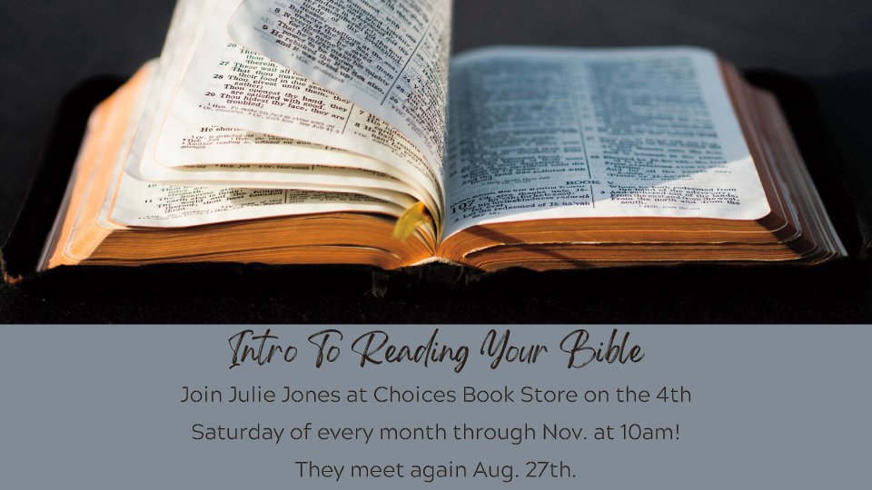 Are you interested in learning how to read your Bible? Join Julie Jones at Choices Christian Living Store on the 4th Saturday of the month at 10am. Choose a Saturday that works for you! November 26