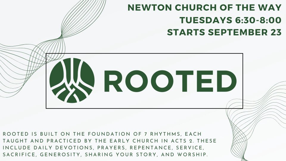 Rooted is an 11-week discipleship experience designed to connect people with God, the church, and their purpose. Rooted is for everyone exploring their faith and reveals who God is and how to live as His disciple. For believers, it refocuses their faith and ignites new passion. Rooted is built on the foundation of 7 rhythms, each taught and practiced by the early church in Acts 2. These include daily devotions, prayers, repentance, service, sacrifice, generosity, sharing your story, and worship. These rhythms are meant to help create regular rhythms to draw you closer to Jesus in Christian fellowship and community! The cost is $20 for the book. If you registered for class, you will get your books the day of your first class.