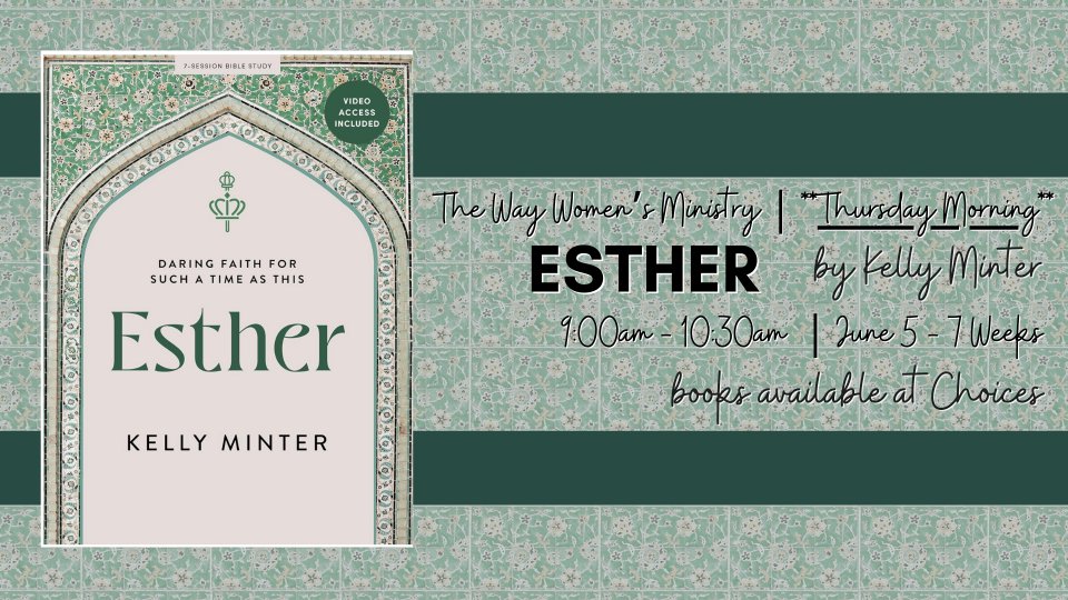 Ladies, grab your friends and join us on Thursday mornings starting June 5th! We will gather from 9am-10:30am to dive into Esther with Kelly Minter. Books are available at Choices or online!