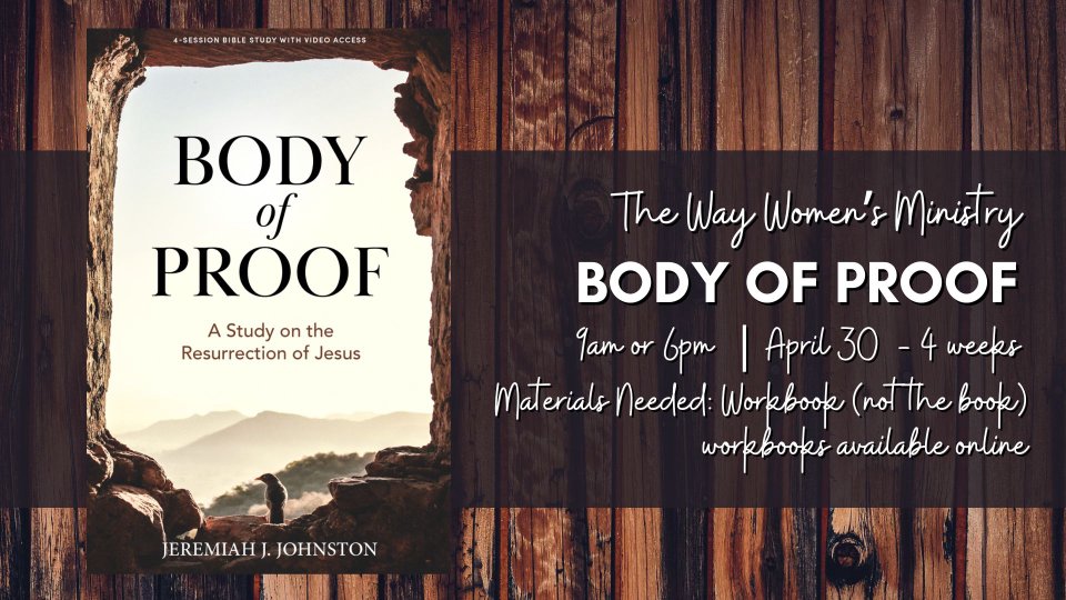 Ladies, join us for our next Bible study, Body of Proof! This class will be 4 weeks beginning on April 30th. We will have a morning class (9am) and an evening class (6pm).