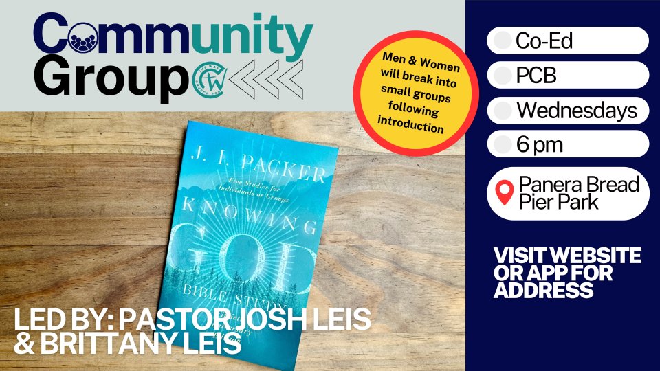 Join us for our church-wide study of "Knowing God". This group will meet at Panera Bread on Wednesday evenings and split into two groups (men and women) after introduction.