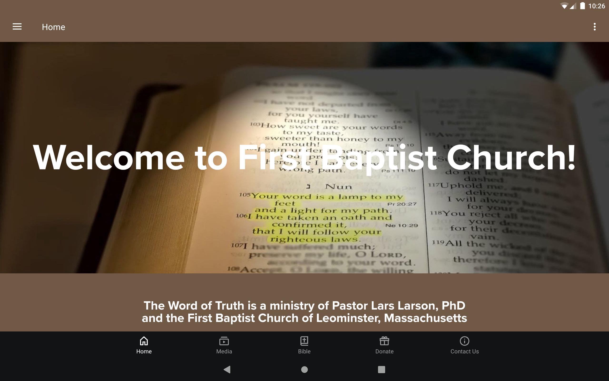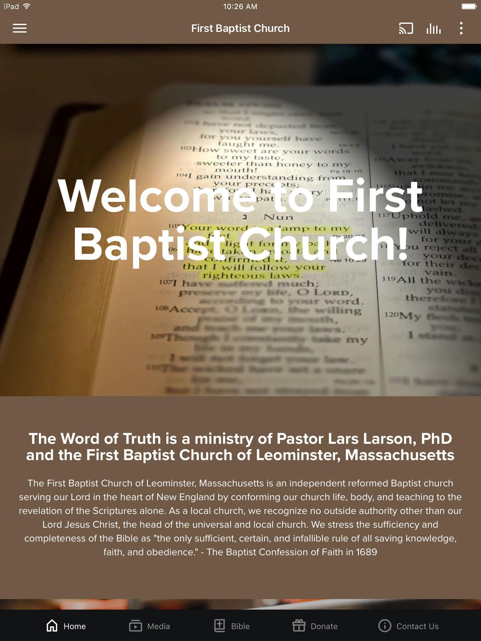 The Word of Truth is a ministry of Pastor Lars Larson, PhD, and the First Baptist Church of Leominster, Massachusetts. Our app allows you to view our sermons, radio programs, the Bible, and much more! The First Baptist Church of Leominster, Massachusetts, is an independent reformed Baptist church serving our Lord in the heart of New England by conforming our church life, body, and teaching to the revelation of the Scriptures alone. As a local church, we recognize no outside authority other than our Lord Jesus Christ, the head of the universal and local church. We stress the sufficiency and completeness of the Bible as "the only sufficient, certain, and infallible rule of all saving knowledge, faith, and obedience." – The Baptist Confession of Faith in 1689 Since we are a reformed church, it is our desire to be always watchful against the traditions of man which creep into the church, and evaluate our church government against God's revealed design. We will always be reforming to the Word of God. Our sincere desire is to serve God and His people by providing clear and insightful Biblical knowledge in our preaching and works. The mission of the First Baptist Church of Leominster, Massachusetts, is to glorify the God of the scriptures in promoting His worship, evangelizing sinners, instructing and edifying the saints, planting and strengthening churches, and showing benevolence to the needy. We are committed to the proclamation of God's perfect Law and the glorious Gospel of His grace to all the world, and to the defense of "the faith once delivered unto the saints." The primary means for the accomplishment of this purpose are prayer and the public and private ministry of the Word of God. We acknowledge no ecclesiastical authority other than our Lord Jesus Christ, who is Head of the Church. Recognizing Jesus Christ as our head, we seek to ascertain and obey His will in all matters of faith and practice. We hold that the final authority and responsibility to determine God's will is vested in the gathered membership of the church. We at First Baptist Church of Leominster, Massachusetts, adopt as the fullest expression of our faith "The Baptist Confession of Faith in 1689". We understand that the ultimate authority in all matters of faith, order, and morals is and must be the Bible alone, as articulated in the opening article of the confession itself. This historic document is, however, an excellent summary of the "things most surely believed among us." We accept it not as an infallible rule or code of faith, but as assistance to us in doctrinal definition, a confirmation in faith, and a means of edification in righteousness. Here, our members have a body of theology in compact form and, by means of scriptural proofs, are ready to give a reason for the hope that is within them. For more information regarding our church, please visit our website at: https://www.thewordoftruth.net.