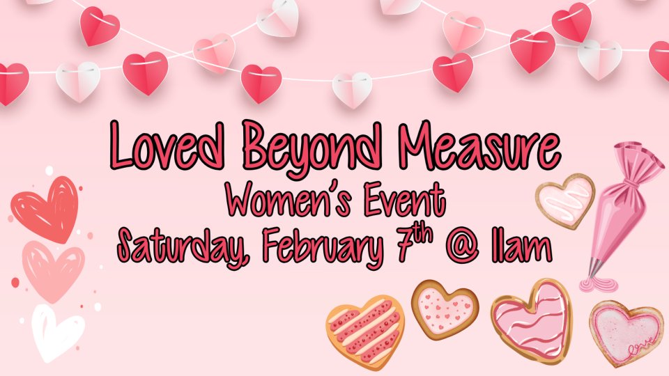 Join us for our Loved Beyond Measure gathering as we celebrate God’s immeasurable love. Guests are encouraged to wear pink or red. Enjoy a meaningful time of fellowship, the Word, table discussions, and a sweet experience as we decorate heart-shaped cookies.
