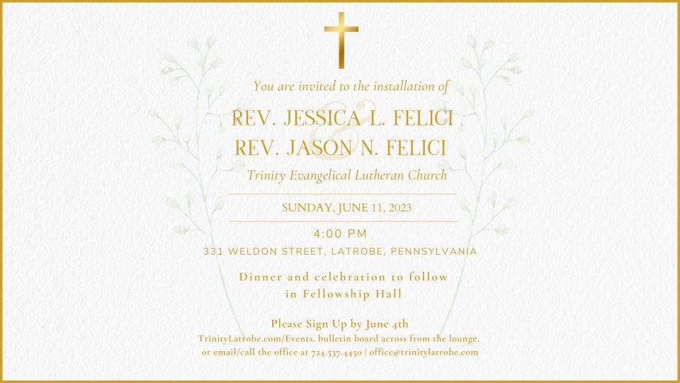 Join us on Sunday, June 11, 2023 at 4:00 pm for the installation of Pastor Jess and Pastor Jason. A celebration dinner will follow in Fellowship Hall. Please sign up by June 4th. Click "Register Now" to add your name and the number of people coming with you.