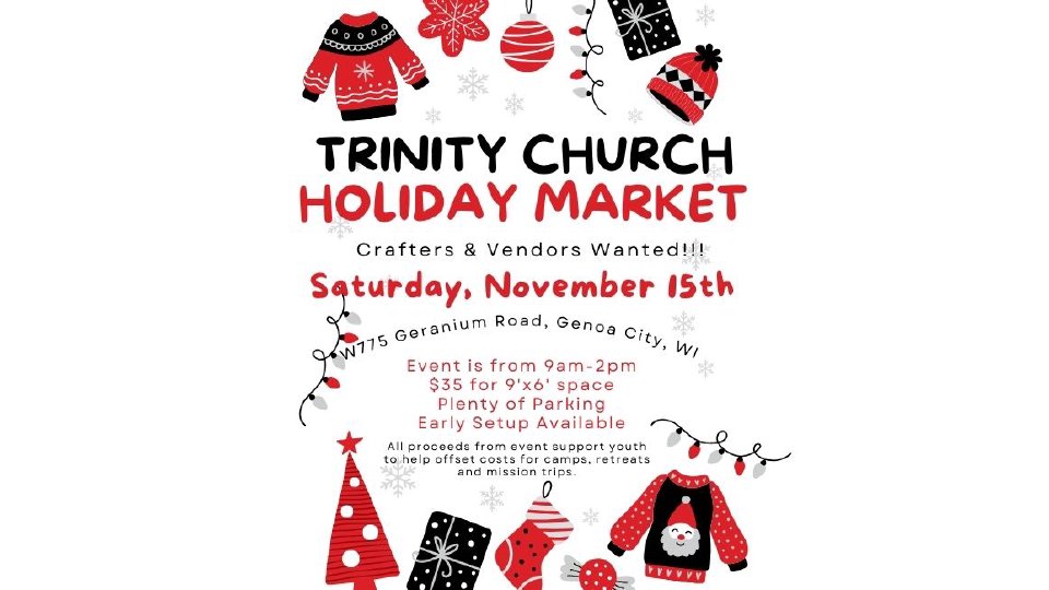 Trinity Youth is hosting their annual Holiday Market on Saturday, November 15th from 9am-2pm. Event has free admission and parking. Concessions will be provided by Trinity Youth. Planning to have Santa and Mrs. Claus available for photos! Special Holiday Music provided by Trinity Youth!!!