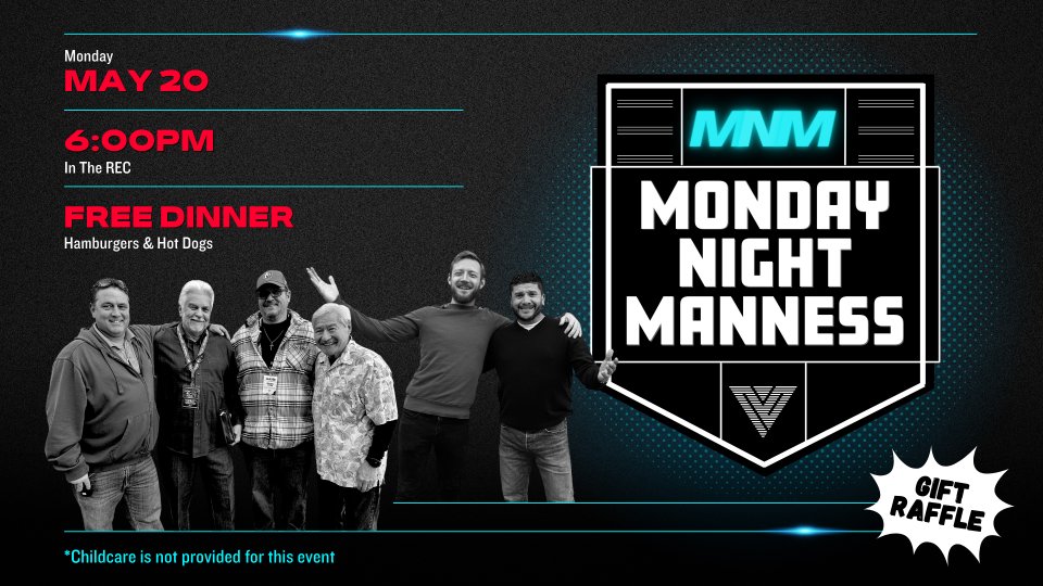 All Valley Vegas men and their guests are invited out Monday, May 20 at 6:00PM in the REC for Monday Night Manness. We will have a FREE dinner, a guest speaker, and a gift raffle. Make plans to come out and be a part of this great event.