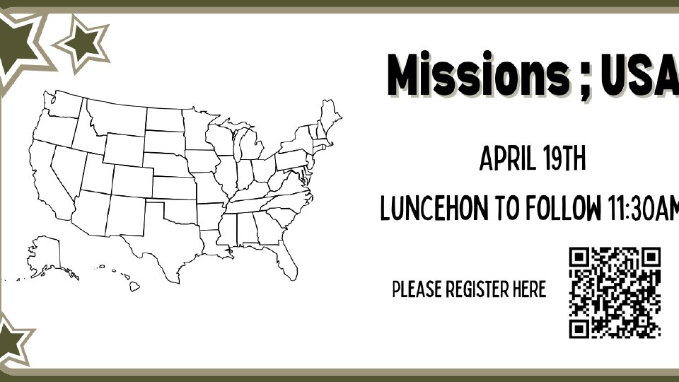 Join us for our Missions Lunch on April 19th! This special gathering is a great opportunity to come together as a community, enjoy a meal, and hear how lives are being impacted through our missions efforts in the USA. You’ll have the chance to learn more about current and upcoming mission opportunities, listen to stories of what God is doing, and discover ways you can get involved.