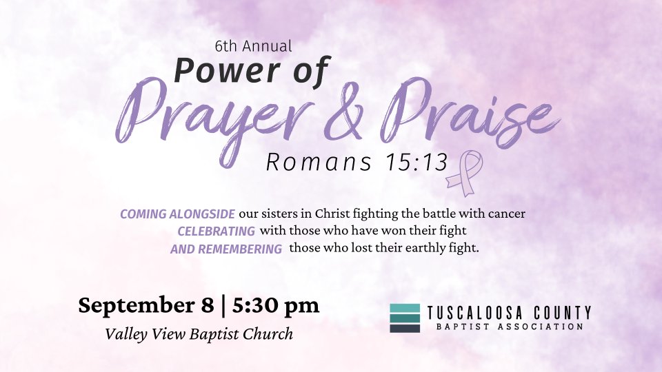Coming alongside our sisters in Christ fighting the battle with cancer, celebrating with those who have won their fight and remembering those who lost their earthly fight. This is a free event for women in the Tuscaloosa County community and surrounding areas organized by the Tuscaloosa County Baptist Association WMU and Women’s Ministry each year.