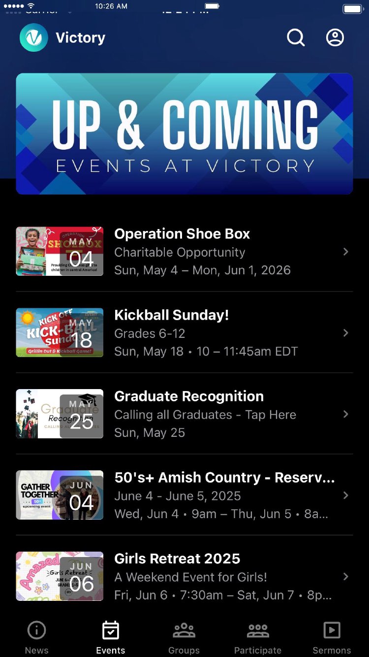 The Victory Church will help you stay connected with with our church family by -Listening to our past sermons -Check out upcoming events -Keep track of our current and upcoming social opportunities -Share your favorite sermons on social media -Stay up to date on what happening at Victory Church