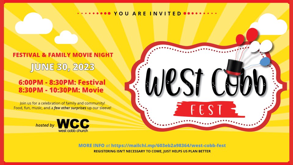 We are so excited to host our very first West Cobb Fest this summer! Mark your calendars for June 30th, 6pm – 10:30pm. There’ll be food, fun, music, and so much more. Come partner with us to help make this community wide event a great success. There are multiple ways to get involved! Please see all details below! Come join us. Registering Your Business Product or Service If you would like to register a business for a booth at West Cobb Fest, time is running out! This is a courtesy email to remind you the deadline to register is May 30th. It's a great opportunity to showcase your business to the local community... and it's FREE! Your cost is simply to provide a game with prizes for the little ones (and possibly big kids) that come by. They play the game, you chat with the parents. 🙂 Here's your link to register your business: https://forms.gle/RZoG6Zr32efuMrqF7 If you know someone who wants to register their business but isn't a WCC Partner, here is their link: https://forms.gle/xvavxoENTF8DRmyUA Registering As A Volunteer If you would like to volunteer to help make, stuff, create, organize, set up, be in charge of a station, or work on something regarding West Cobb Fest, we would love for you to do that also so we know where we still have gaps to fill. If you have a family member or friend who isn't a WCC Partner that wants to do it with you, sign them up too! It's a community event after all. 🙂 When you click the link, list your top three choices to serve - we will do our best to give you your first choice. Here's your link to signup as a volunteer: https://forms.gle/gCzHZgK3s9vzfxuk7 We are excited to serve with you and see what incredible businesses we have secretly hidden in this fantastic church! If you have any questions please contact Jade Getchell (jade.g@westcobbchurch.com) and Mary Jasper, West Cobb Fest Coordinators.