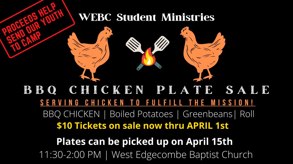 Tickets are on sale now thru April 1 for the BBQ plate sale for our WEBC Youth to raise funds to go to Fuge this year! For just $10 per plate, you'll get BBQ chicken, boiled potatoes, green beans, and a roll - cooked by our own Cokey Swamp BBQ Boys. To purchase plate tickets, contact one of the WEBC Youth or Ryan Holloman - youth@westedgecombebaptist.com