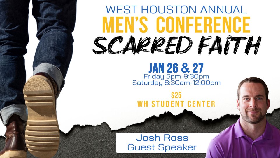 Guys! Our annual Men's Conference is January 26-27, 2024. Our speaker this year will be Josh Ross. Join us for fun, fellowship, food, worship, small groups, and challenging messages. Invite your friends! Cost is $25. Click on the button below to register. Friday 5:00-9:30pm Saturday 8:30am-12:00pm