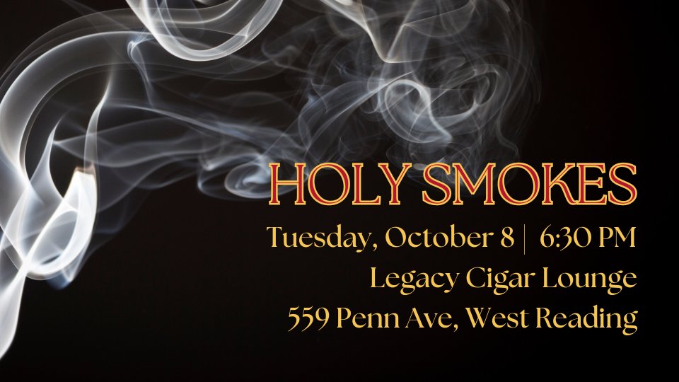 Calling all cigar aficionados and novices! You're invited to participate in a unique and enjoyable experience while exploring our shared faith through a study of scripture and a good stogie. Come join our cigar night at Legacy Cigar Lounge, 559 Penn Ave, West Reading, as this will be a wonderful opportunity to gather and discuss scripture. Reservations will be made for a private area. Participants must be 21 years of age or older. Participants will purchase their own products, if they desire.