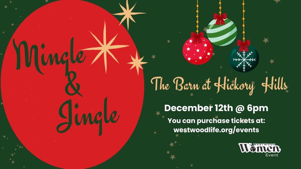 Westwood Women's Ministry invites you to Mingle and Jingle on December 12th at 6pm. The event will take place at the Barn at Hickory Hills. Come and enjoy a break from the hustle and bustle with other women. Dinner will be catered for the event.