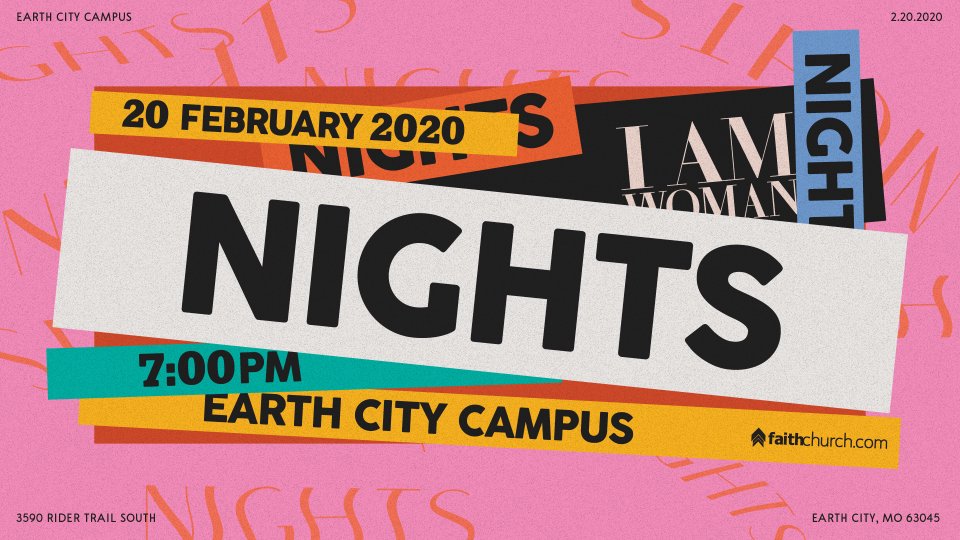 Treat yourself to some quality girl time at “I Am Woman Nights,” Thursday, February 20th at 7:00 pm! Be inspired by passionate worship and encouraged by a powerful message from Pastor Nicole Crank! Get out of the house, take a break from the routine, and make some new friends! Be part of the I Am Woman Community! Stay for a FUN after-party with a live DJ and dancing! Food trucks will be on hand before and after starting at 6PM with plenty of tasty items for purchase. FREE Childcare for ages 0-4 is provided. Don’t forget to save the date! Everyone will receive some fun surprises just for attending! Don’t miss this ultimate ladies night with I Am Woman! You’re gonna’ leave ready to take on the WORLD! (Faith Church, 3590 Rider Trail South, Earth City, MO 63045)