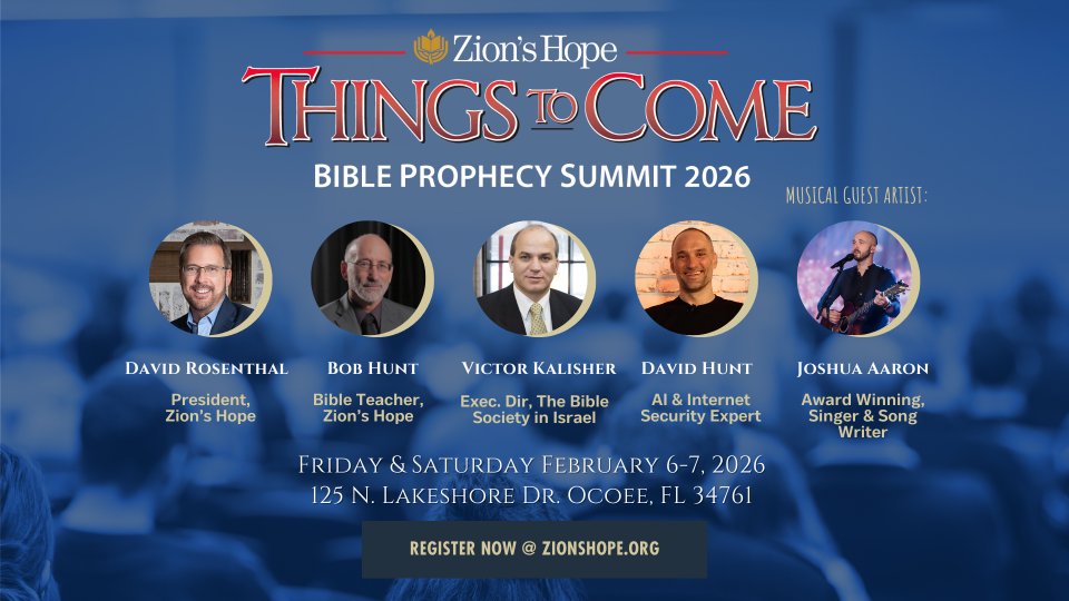 Registration is now open for the Things to Come Prophecy Summit! Join Zion’s Hope for a dynamic weekend of End-Times teaching, geo-political insights, and biblical clarity on Israel and the rapidly emerging world of AI, crypto, and quantum technology for Christians. Hear from David Rosenthal, Bob Hunt, Victor Kalisher, and David Hunt, and enjoy special musical performances by award-winning worship artist Joshua Aaron, recently recognized as one of the Jewish Global 100 influencers.