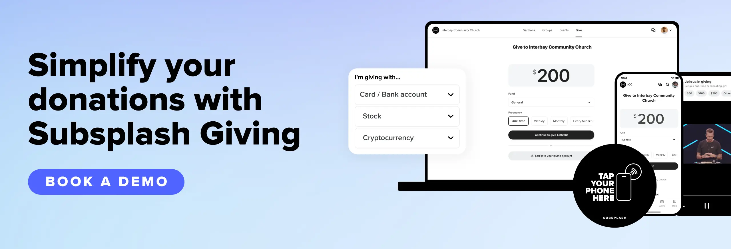 And platforms like Subsplash make this easy. Subsplash helps churches make giving easier from recurring tithes to non-cash gifts, Donor Advised Funds, and QCDs.