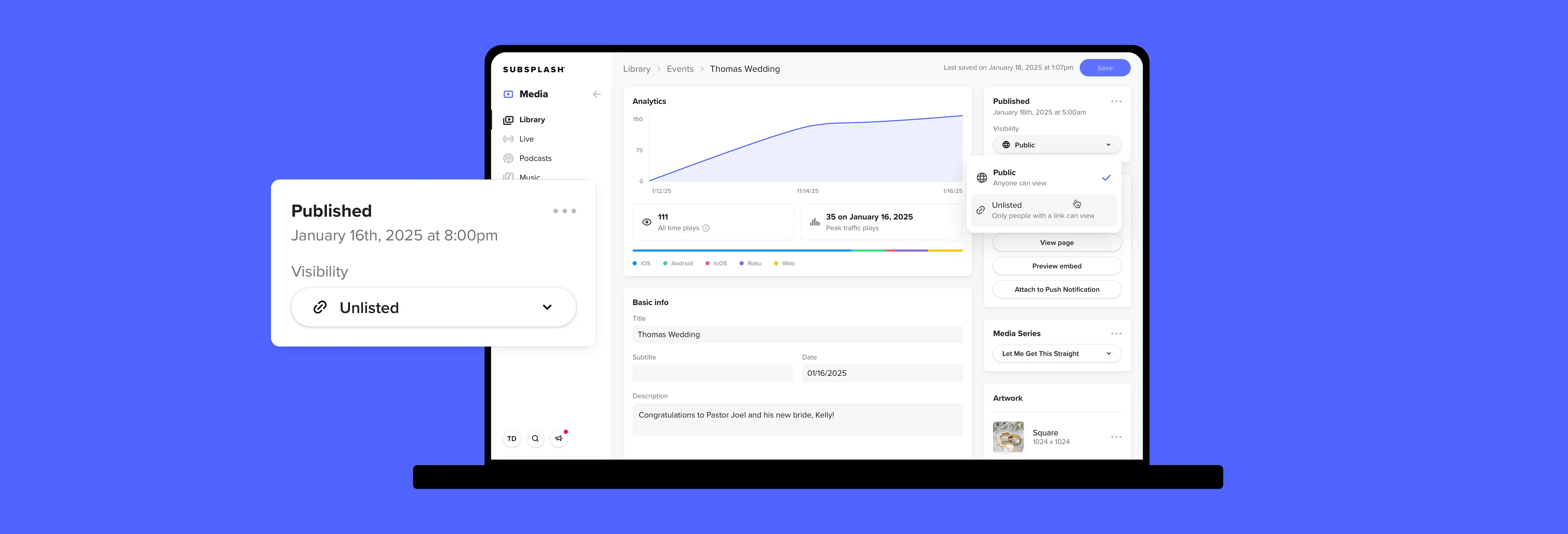 Unlisted content is shared via a URL, which can be sent through push notifications, QR codes, Mailouts, or embedded on your website—all easily managed in your Subsplash Dashboard.