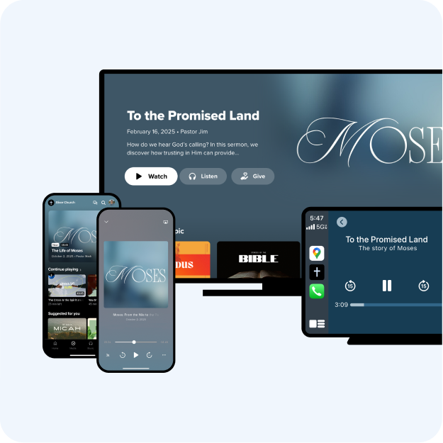 Stay connected with your community anytime, anywhere with a custom mobile app found in every major app store. Powerful features like audio and video streaming, push notifications, and in-app giving will help increase engagement and make disciples.