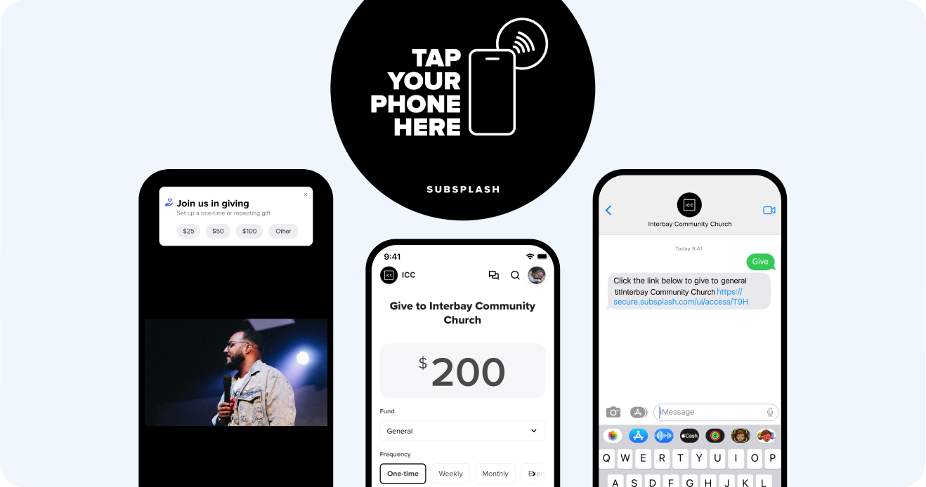Your donors can give in your app, by tap, on your website, via SMS text, and even during live streams!