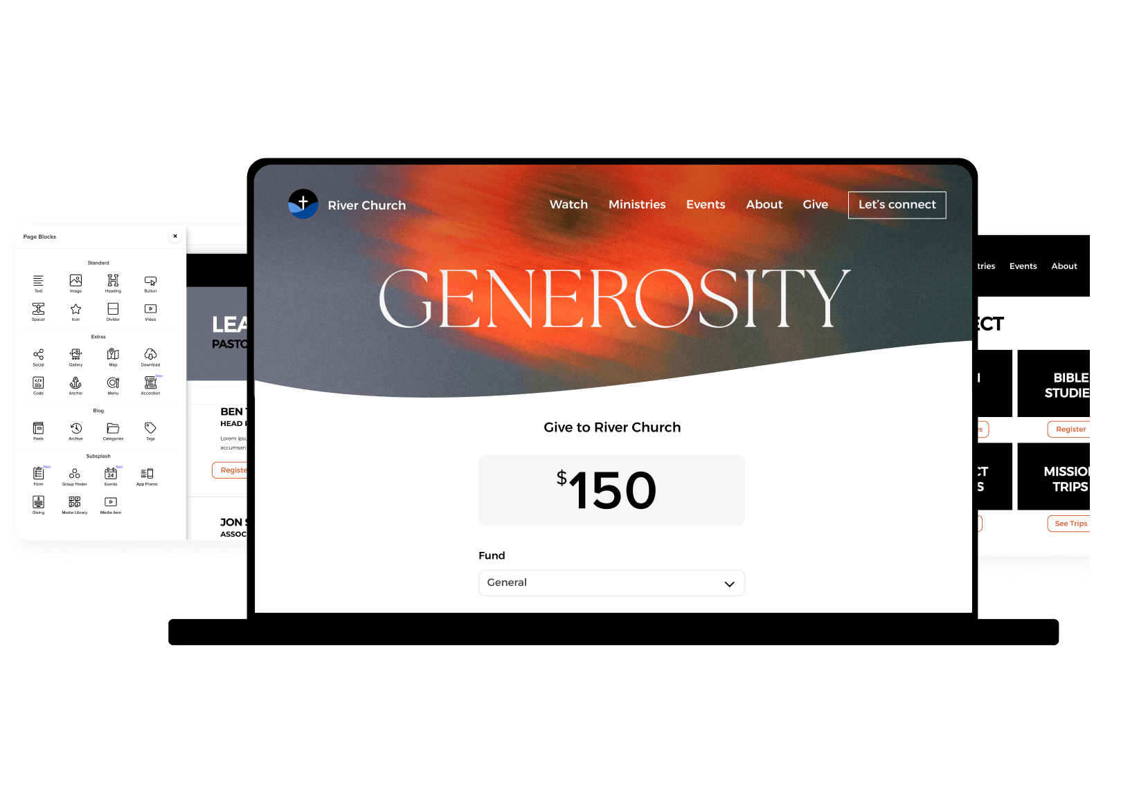 Use the Subsplash drag-and-drop website builder to quickly connect and display sermons, giving, livestreams, and events—turning your gorgeous digital doorstep into a powerful engine for ministry